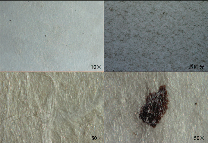 構皮纖維雖不及麻纖維那么長,但遠長于竹纖維,一般在5-10mm 左右。由于構皮本身具有一定的白度,纖維素含量也比較高,因此構皮紙成紙白度一般要高于麻紙和竹紙,構皮紙質地較麻紙綿軟,韌性好,常被稱為“白棉紙”,亦有“蟬翼”、“冰肌”等雅喻。構皮紙紙面的勻度和平滑度一般介于麻紙和竹紙之間,由于蒸煮過程中用到草木灰,構皮紙一般潔白中略偏灰色,紙面纖維在光線照射下會泛出絲質光澤。由于纖維較長不易分散,成紙內常見有未打散的纖維束,形態(tài)蜿蜒曲折,兩端多散開呈絮狀(如圖1 左下)。構皮紙在存放一段時間之后,紙面常見有零星的淺銹黃色暈點狀氧化斑,曾有文人墨客因此雅稱其為“桃花紙”。另外,手工抄造的構皮紙在纖維間還常會殘留一些構皮外皮的黑灰色碎屑,這也是構皮紙的一個特征(如圖1 右下)。